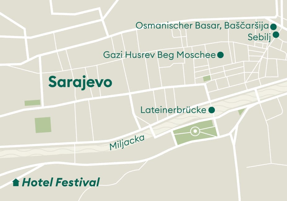 Nutzen Sie den heutigen Tag für eigene Entdeckungen und tauchen Sie noch einmal ein, in die kulturelle Vielfalt der Stadt. Achten Sie bei Ihrem Spaziergang durch die Stadt beispielsweise auf «Die Rosen von Sarajevo», eine ganz besondere Gedenkstätte, die an die täglich eingeschlagenen Granaten während der Kriegszeiten erinnert. Die Einschlagstellen sind mit rotem Harz markiert und sollen an die Menschen erinnern, die ihr Leben verloren haben.